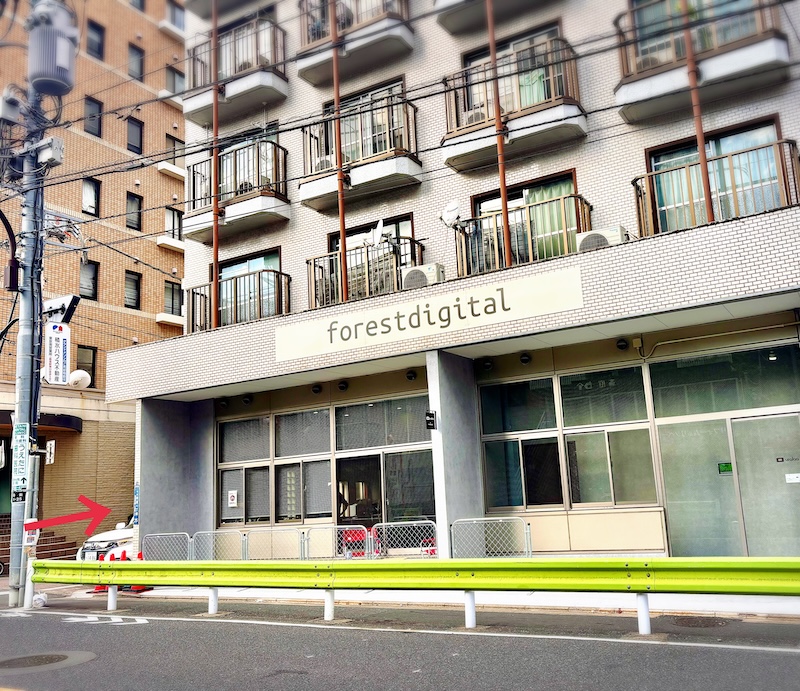 ④50メートルほど進んでいくと目的地のマンションが右手にございます。入り口は、forestdigitalと表示があるこちらのマンション角を右に曲がるとございます。